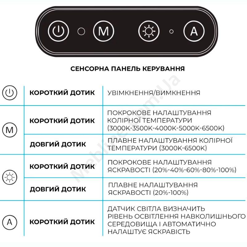 - Сенсорна панель керування з налаштуванням колірної температури та яскравості.