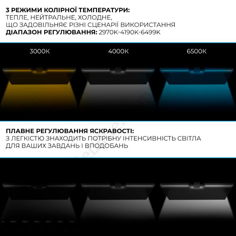 - Налаштування колірної температури — тепле, нейтральне, холодне (3000K, 4000K, 6500K).