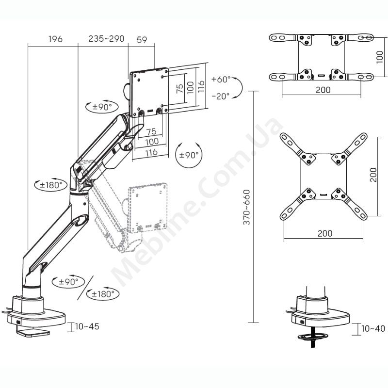 - VESA 75x75 мм, 100x100 мм, 200x100 мм, 200x200 мм, 100x200 мм.