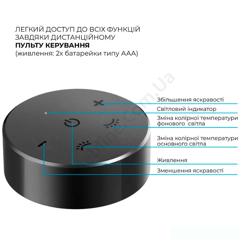 - Дистанційний пульт керування на двох батарейках ААА.