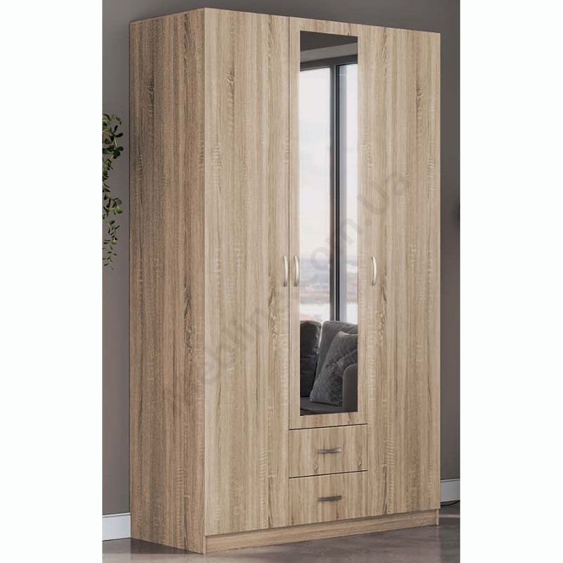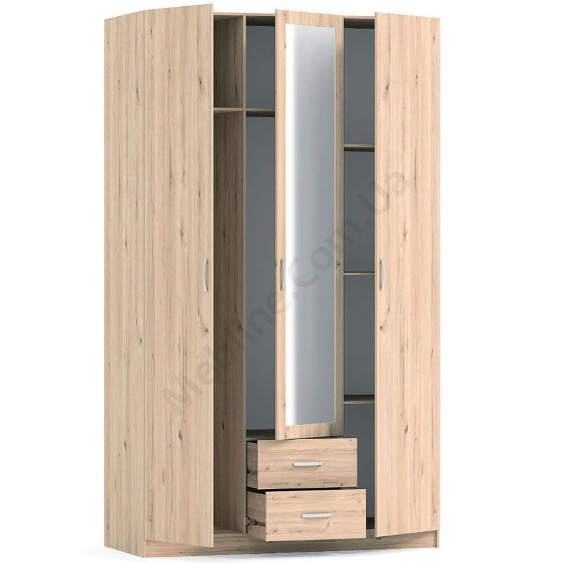 Тридверна шафа з дзеркалом, шухлядами, штангою та полицями.