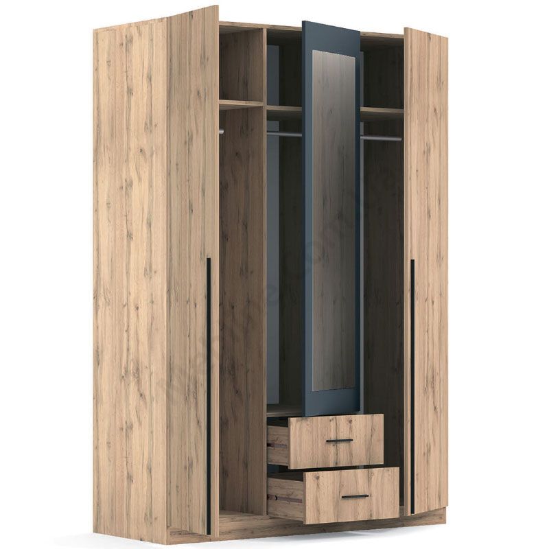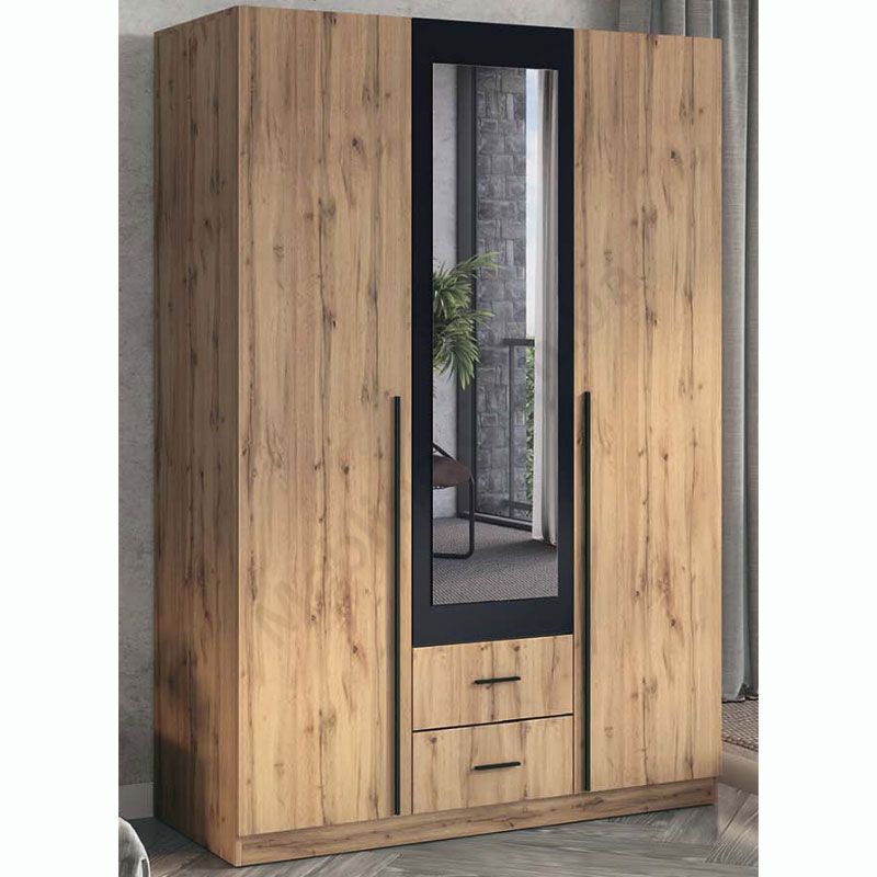 Тридверна шафа з шухлядами, дзеркалом та штангами для одягу.