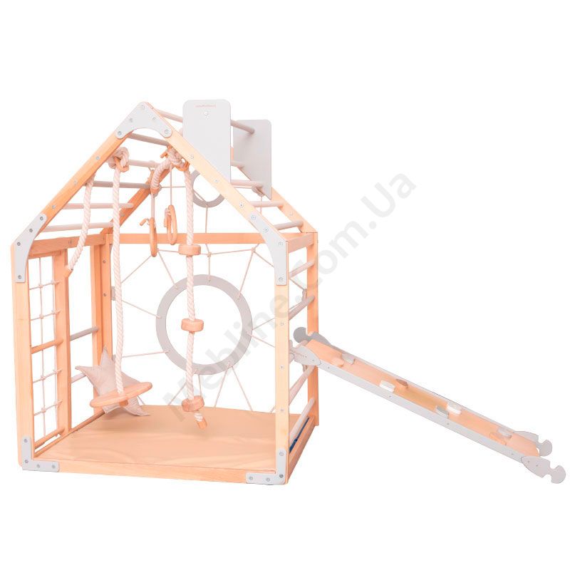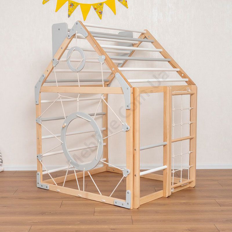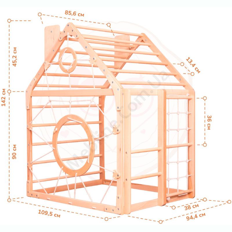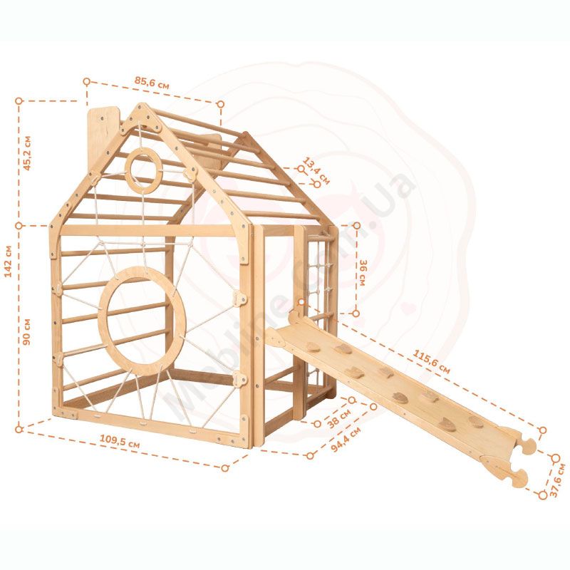 Дитячий дерев’яний комплекс для лазіння у вигляді будинка з аксесуарами.