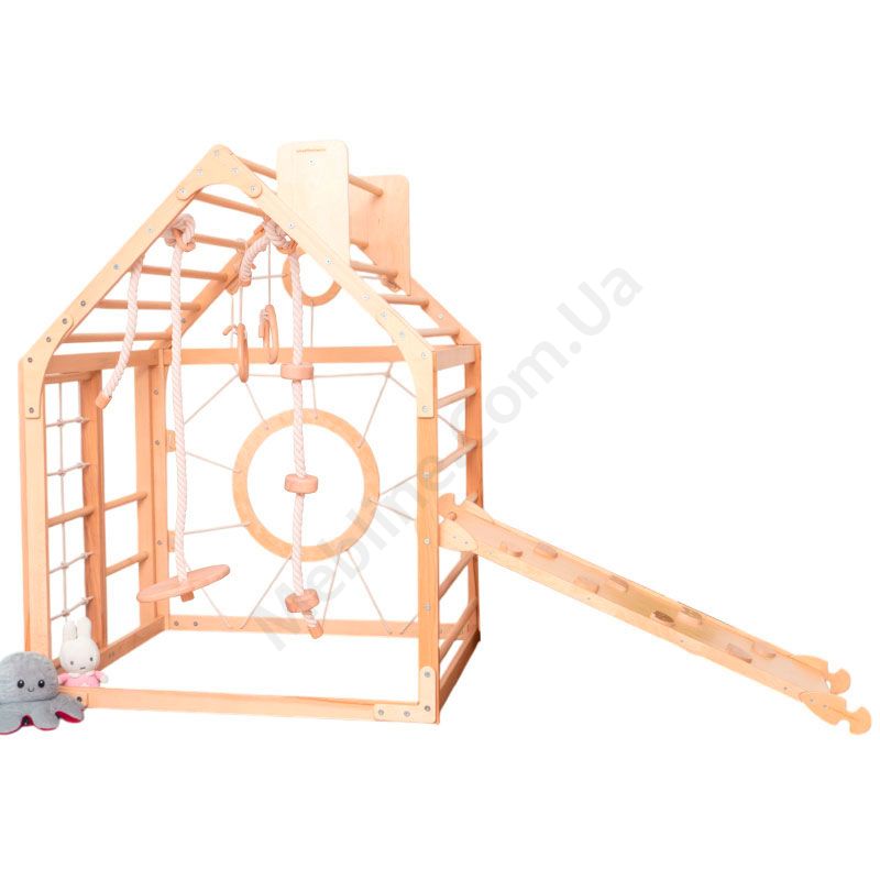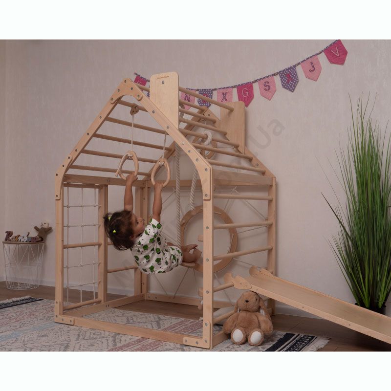 Дитячий дерев’яний комплекс для лазіння у вигляді будинка з аксесуарами.