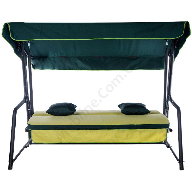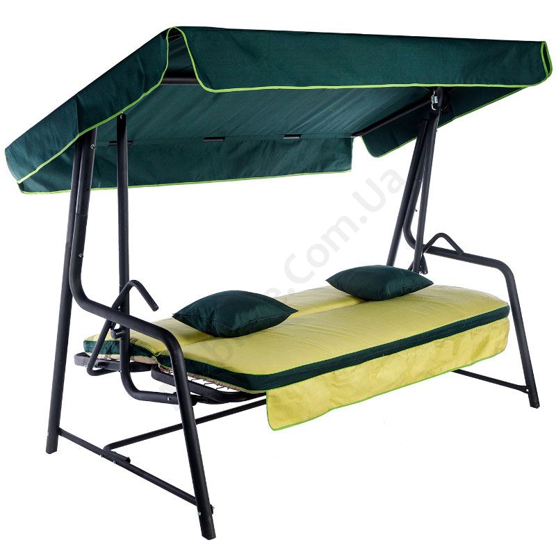 Гойдалка з розкладним диваном та тентом, зеленого кольору з жовтим матрацом.