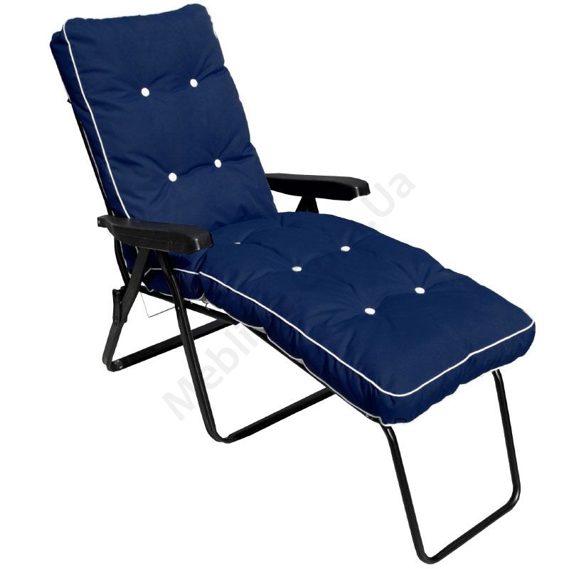 Розкладний шезлонг з матрацом темно-синього кольору.