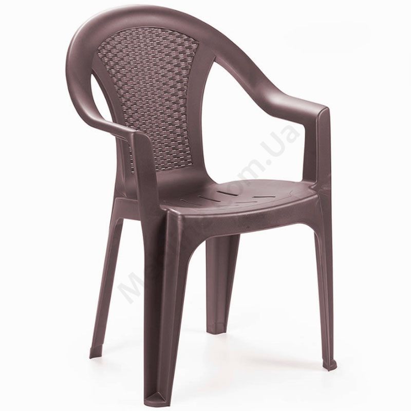 Пластиковий садовий стілець з підлокітниками коричневого кольору.