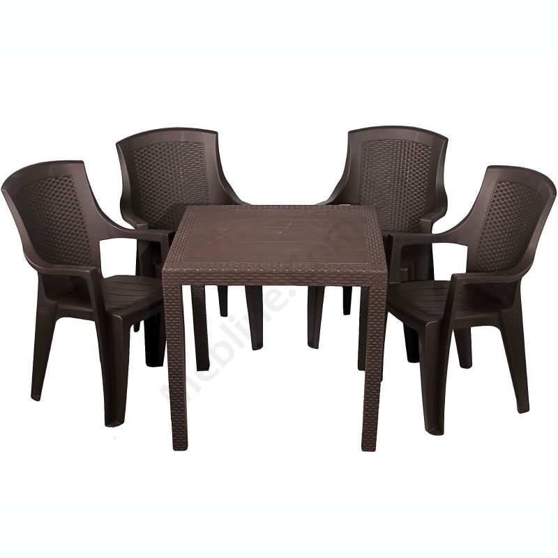 Набір пластикових меблів коричневого кольору зі столом та чотирма стільцями.
