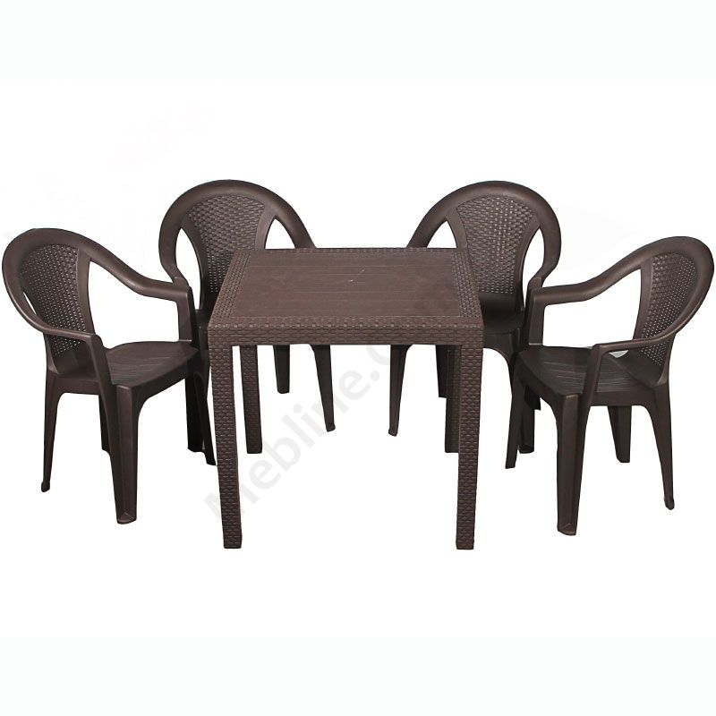 Набір пластикових меблів коричневого кольору зі столом та чотирма стільцями.