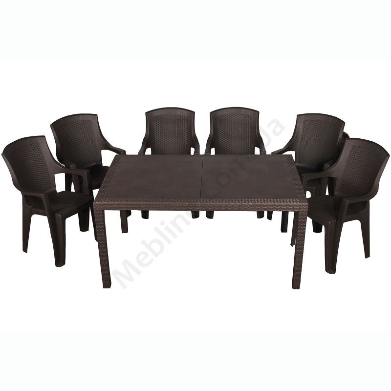 Набір пластикових меблів коричневого кольору зі столом та шістьма стільцями.