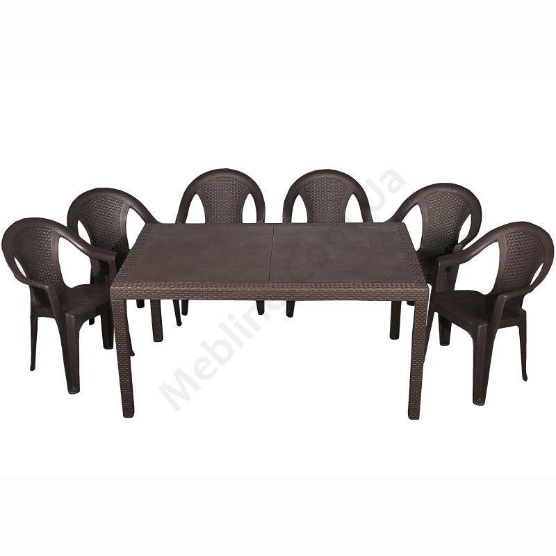 Набір пластикових меблів коричневого кольору зі столом та шістьма стільцями.