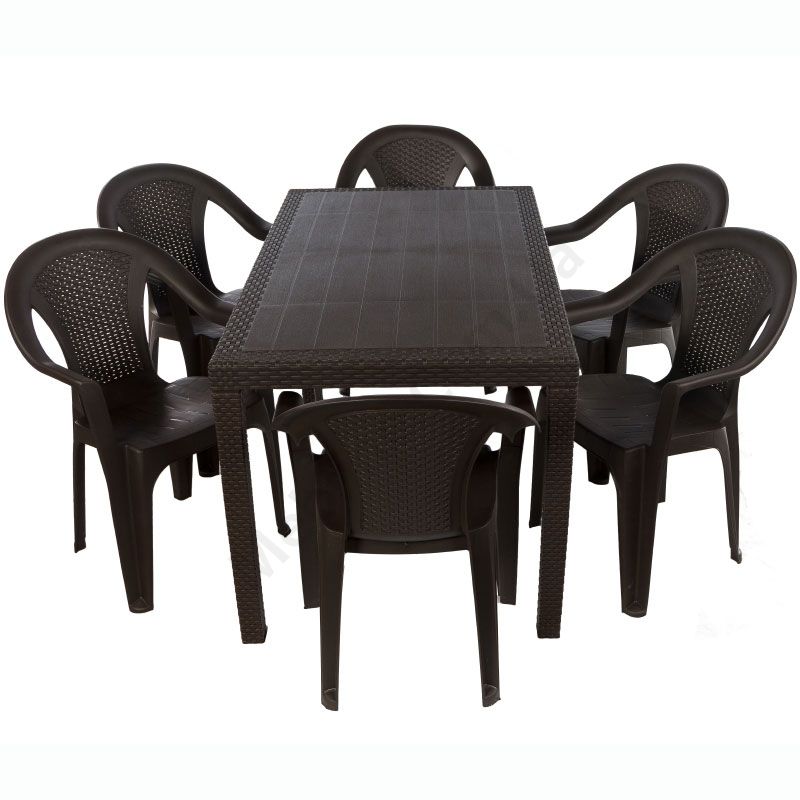 Набір пластикових меблів коричневого кольору зі столом та шістьма стільцями.