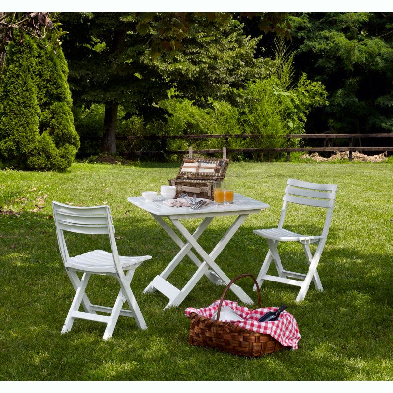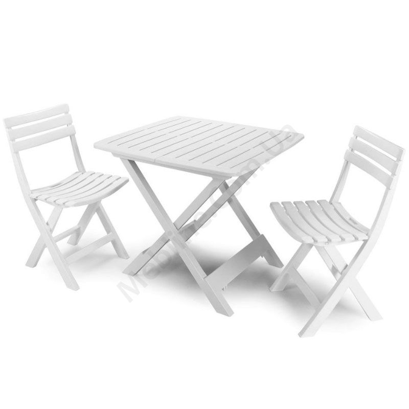Набір складаних пластикових меблів білого кольору зі столом та двома стільцями.