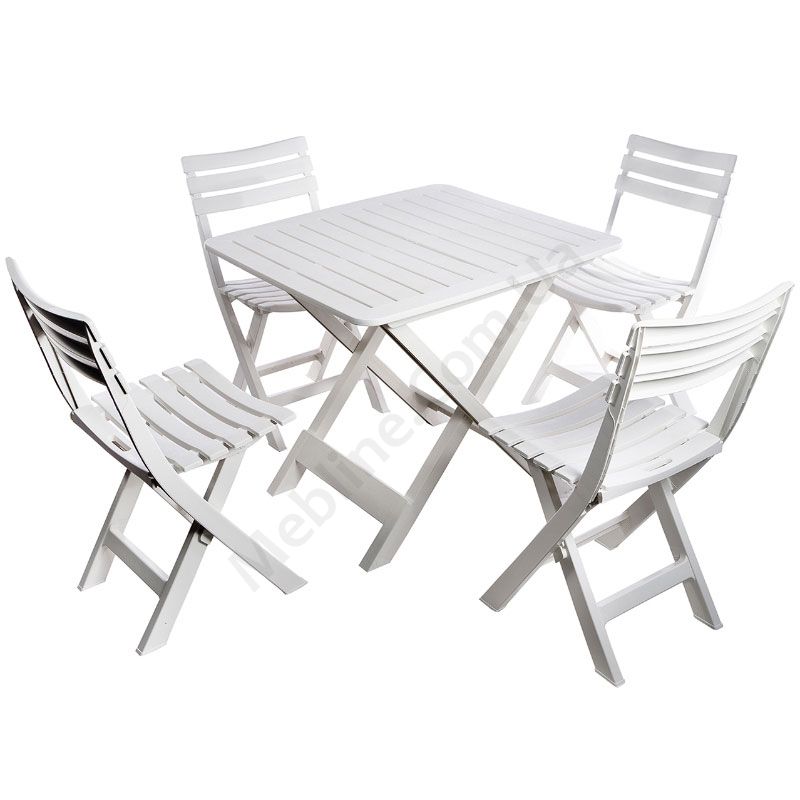 Набір складаних пластикових меблів білого кольору зі столом та чотирма стільцями.