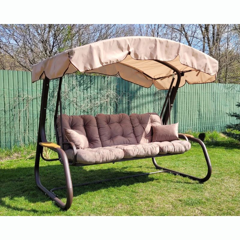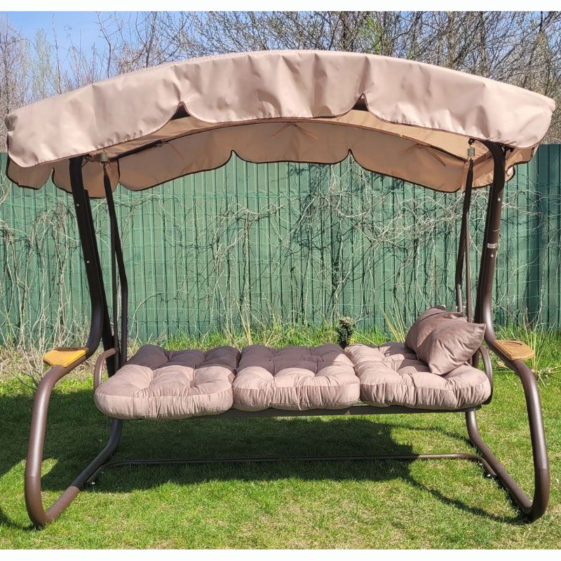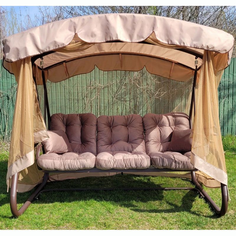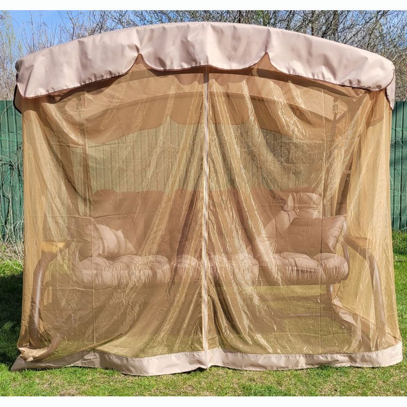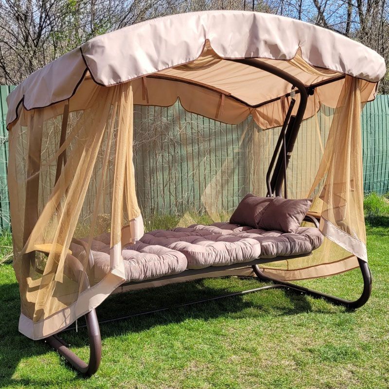 Металева садова гойдалка з тентом, москітною сіткою та коричневим матрацом.
