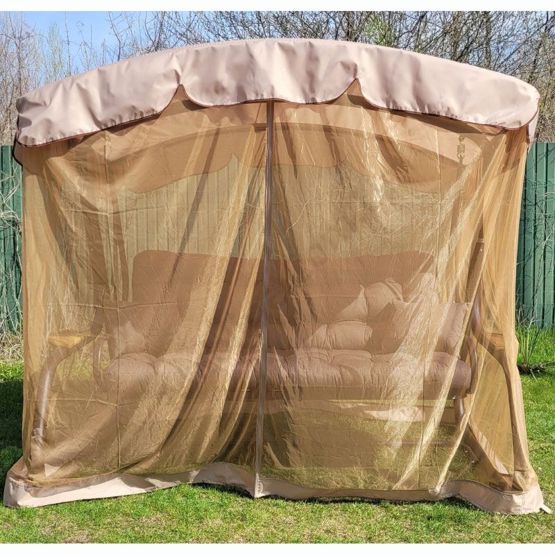 Металева садова гойдалка з тентом, москітною сіткою та коричневим матрацом.