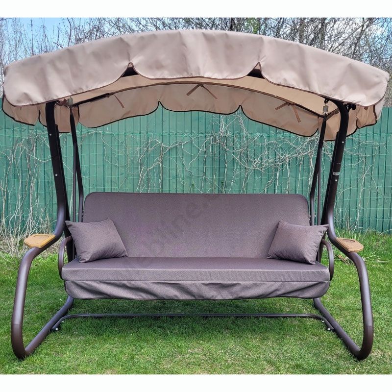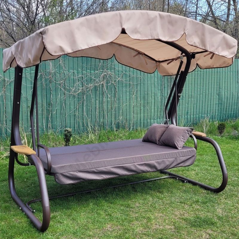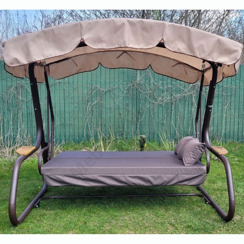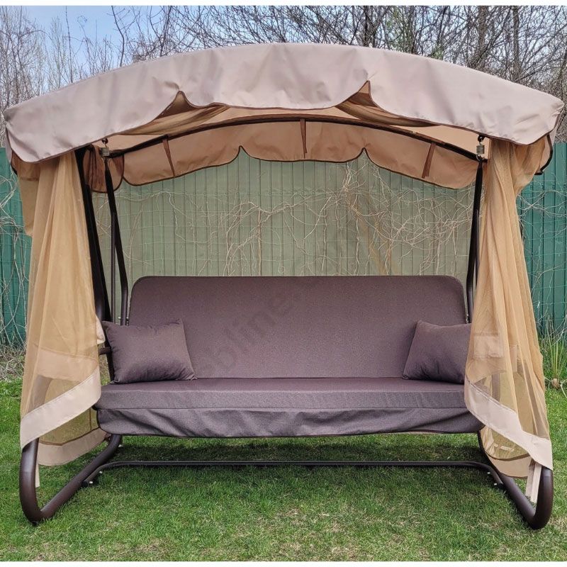 Металева садова гойдалка з тентом, москітною сіткою та коричневим матрацом.