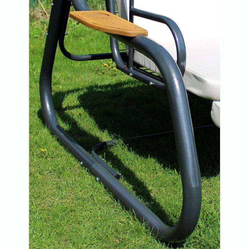 Металева садова гойдалка з тентом, москітною сіткою та коричневим матрацом.