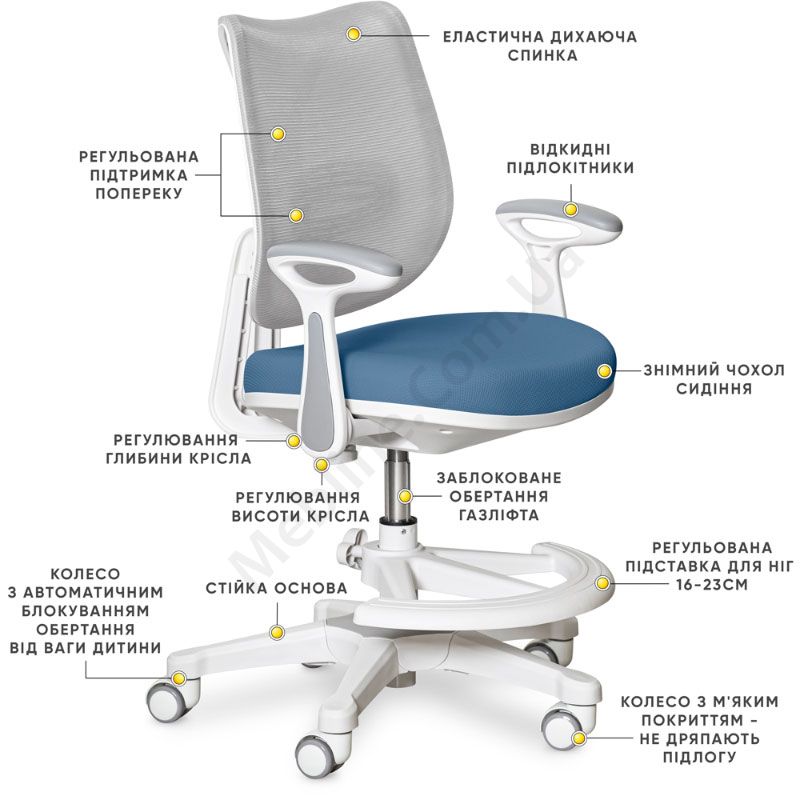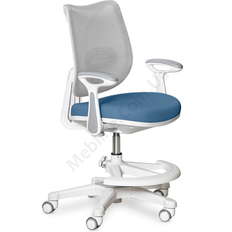 Ортопедичне крісло для школяра синього кольору з сітчастою спинкою регулюванням глибини, висоти та підставки для ніг.