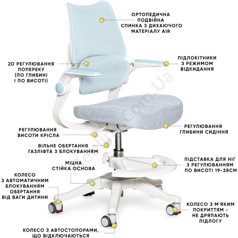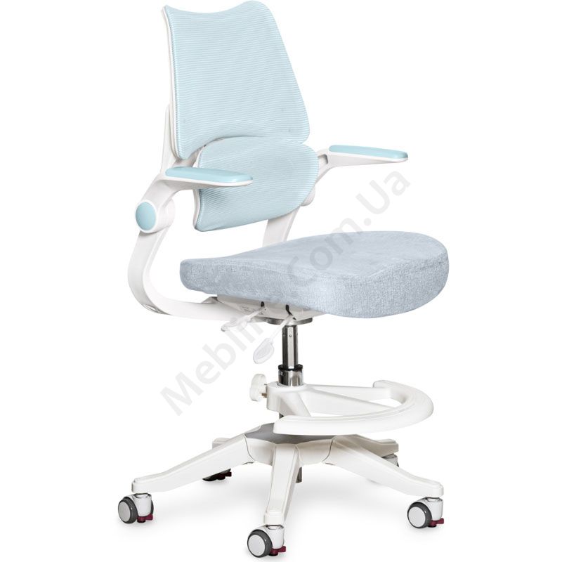 Ортопедичне крісло блакитного кольору з подвійною спинкою, регулюванням глибини, висоти та підтримки попереку.