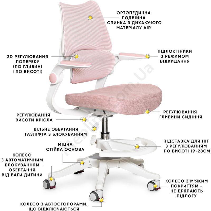 Ортопедичне крісло рожевого кольору з подвійною спинкою, регулюванням глибини, висоти та підтримки попереку.