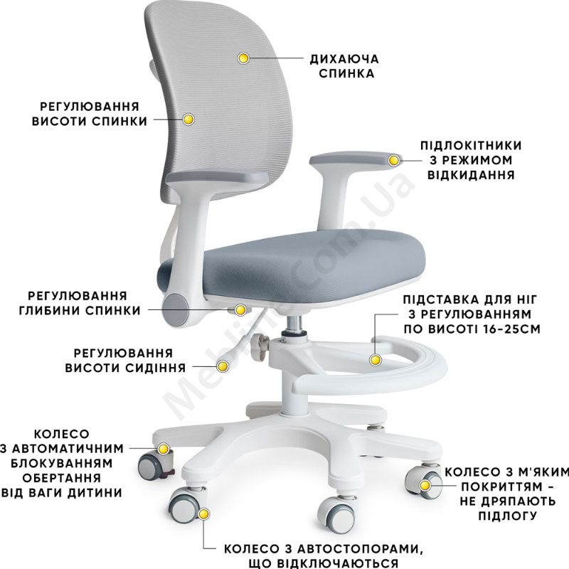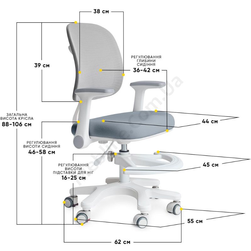 - Регулювання висоти сидіння та висоти спинки.