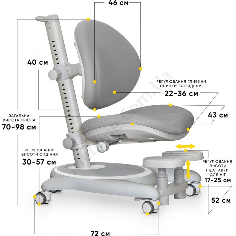 Ортопедичне крісло сірого кольору з регулюванням глибини, висоти та підставки для ніг.