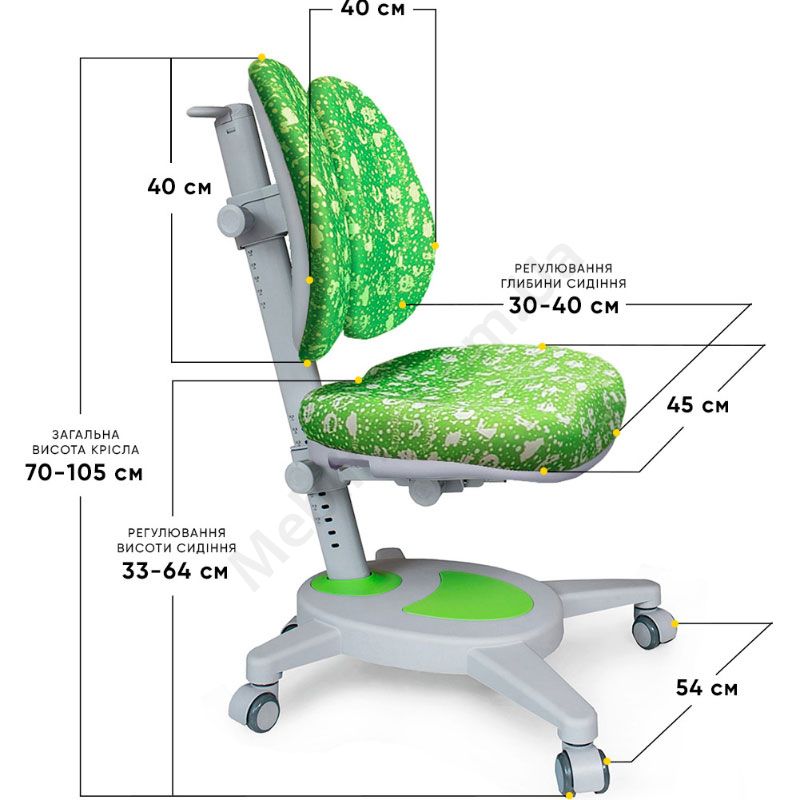 Ортопедичне крісло зеленого принтованого кольору з подвійною спинкою, регулюванням глибини та висоти.