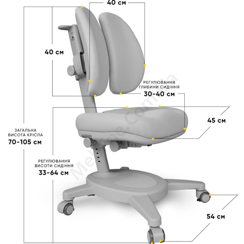 Ортопедичне крісло сірого кольору з подвійною спинкою, регулюванням глибини та висоти.