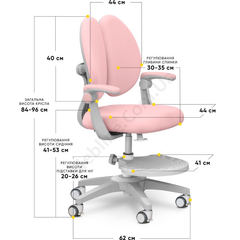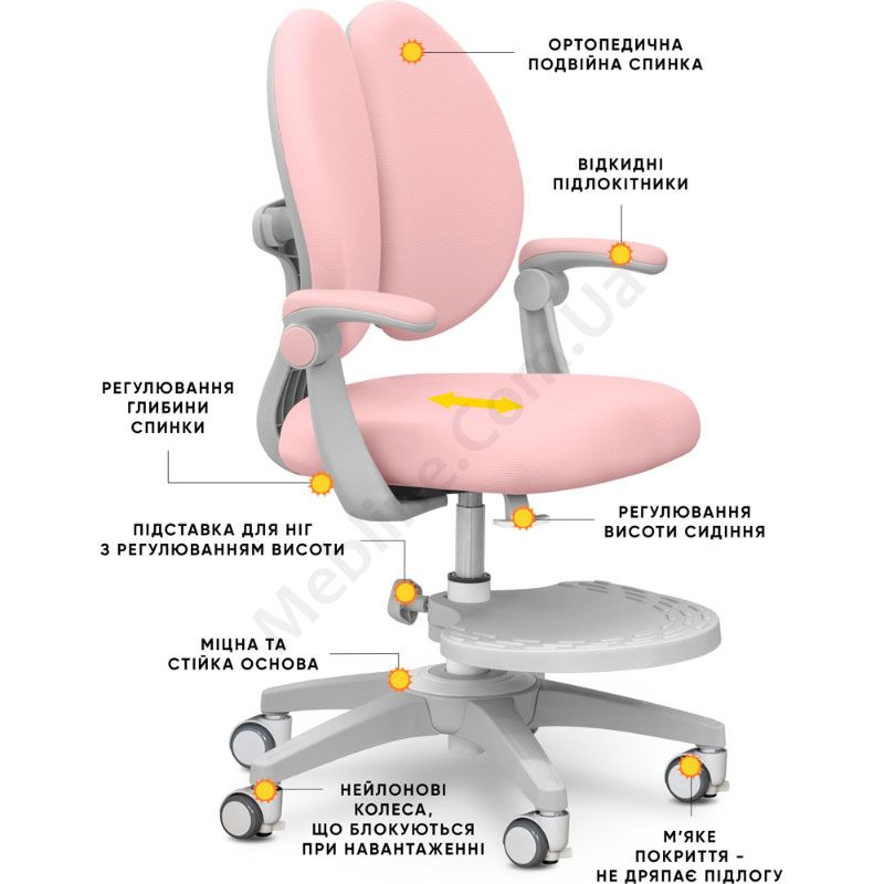 Ортопедичне крісло рожевого кольору з подвійною спинкою, регулюванням глибини та висоти.