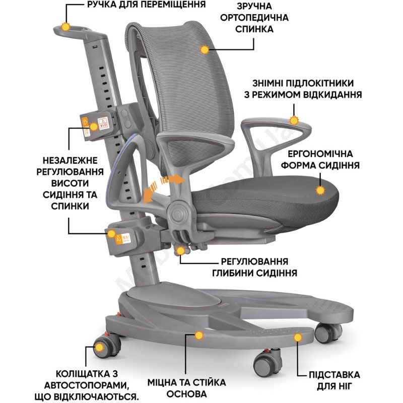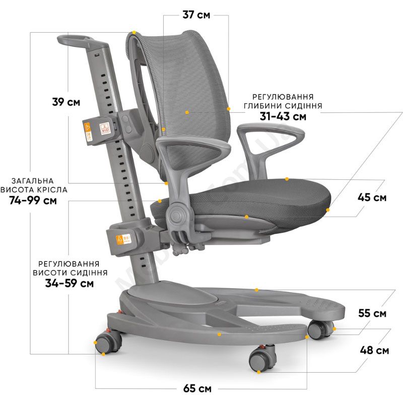 Ортопедичне крісло сірого кольору зсітчастою спинкою, регулюванням глибини та висоти.