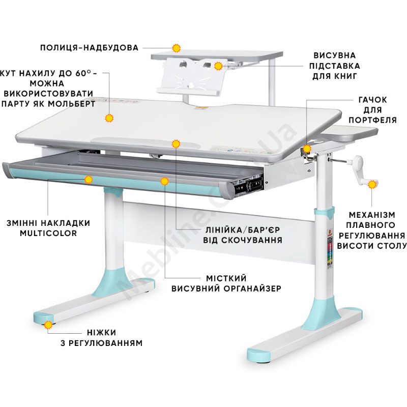 У магазині Ви можете купити Дитячий стіл Edmonton Multicolor BL з поличкою S50 (BD-610 W/MC + BL + S50 WG) за доступною ціною та доставкою по всій Україні. Обирайте Парта від фабрики Mealux для облаштування дитячої в інтернет магазині меблів.