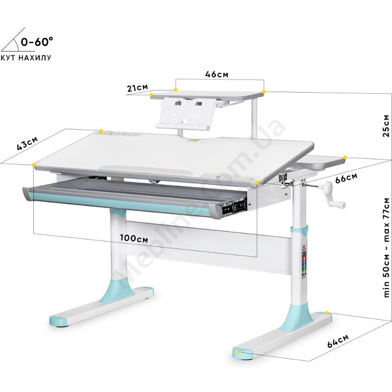 - Кут нахилу стільниці регулюється в діапазоні 0°-60°.