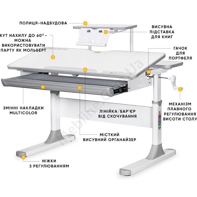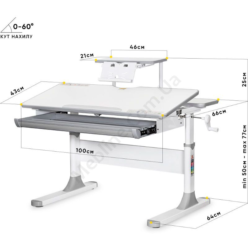 Зростаюча парта з поличкою, шухлядою та регулюванням нахилу та висоти.