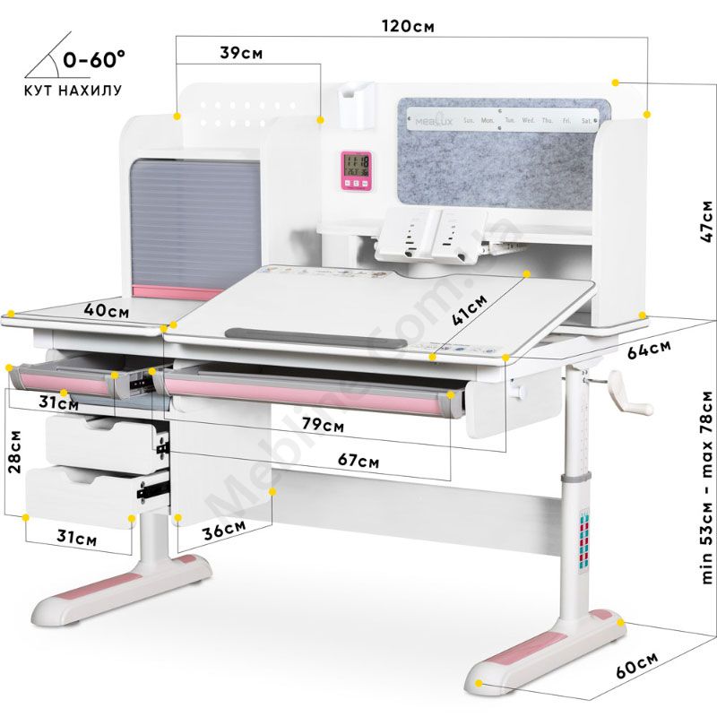 - Кут нахилу стільниці регулюється в діапазоні 0°-60°.