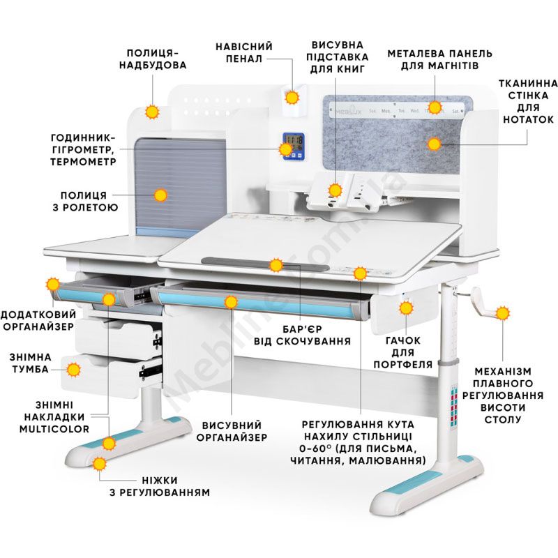 Зростаюча парта з надставкою, шухлядами та регулюванням нахилу та висоти.