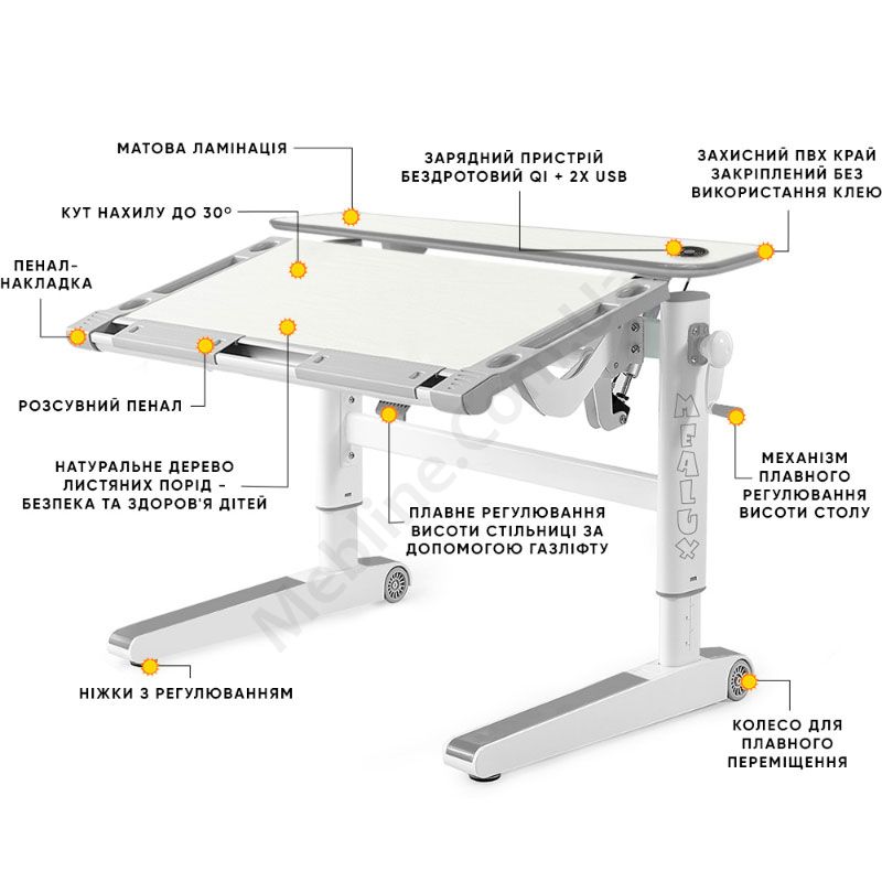 • На стільниці розсувний пенал та бічний пенал-накладка.