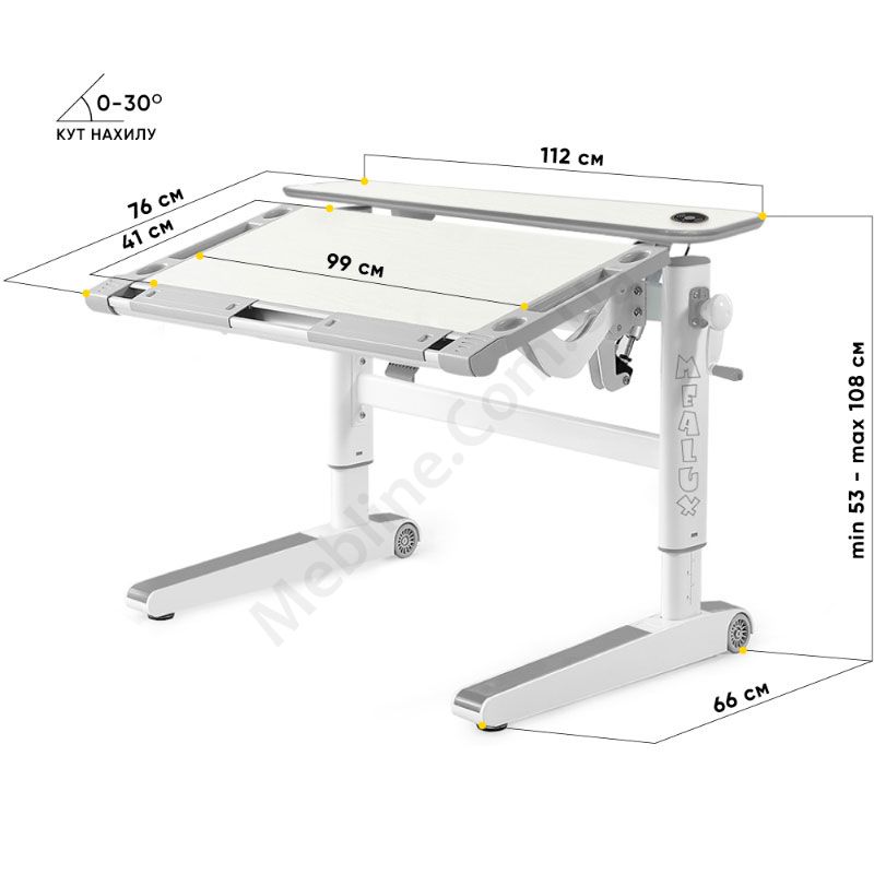 • Кут нахилу стільниці регулюється за допомогою газліфта в діапазоні 0°-30°.
