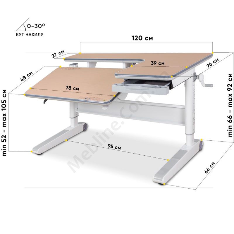 - Кут нахилу стільниці регулюється в діапазоні 0°-30°.