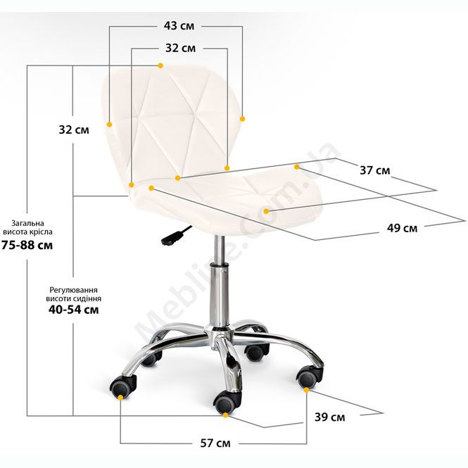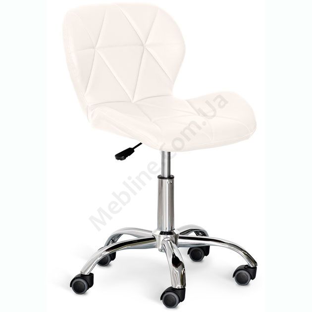 Поворотне крісло білого кольору без підлокітників на роликах.