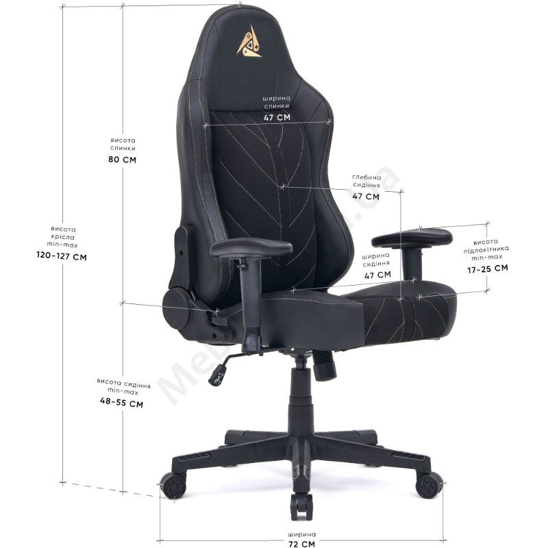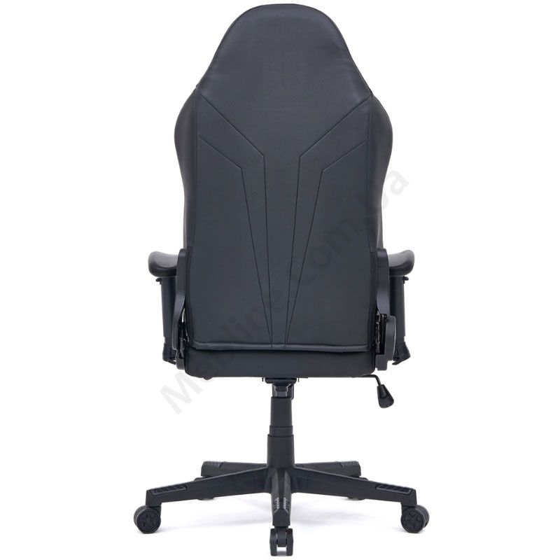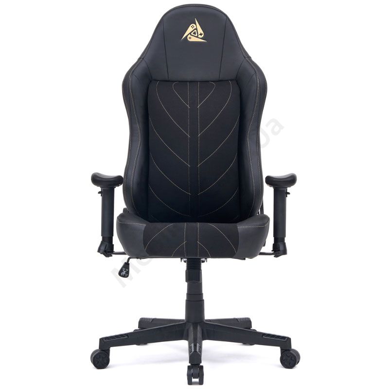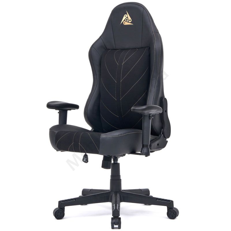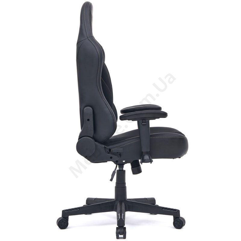 Геймерське крісло чорного кольору з регульованими підлокітниками, підголівником та гойданням.