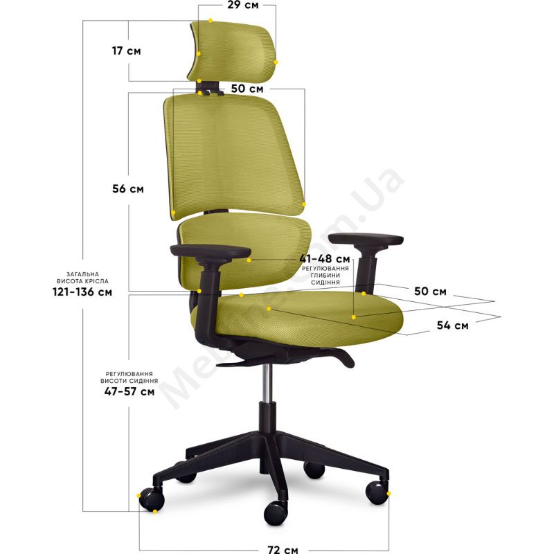 Крісло зеленого кольору з регульованими підлокітниками, підголівником та регулюванням глибини.