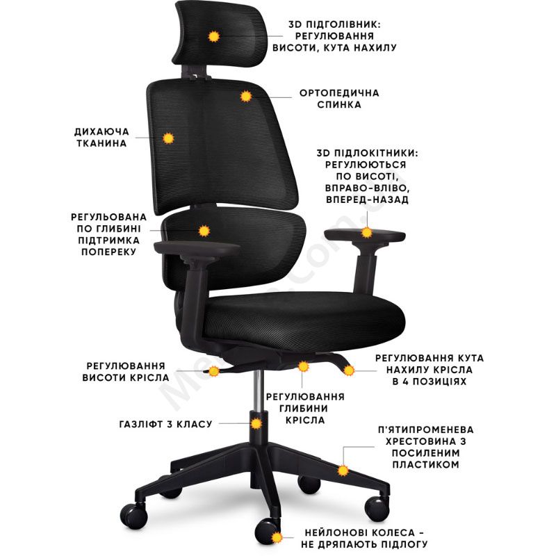 - Висота крісла та обертання регулюється за допомогою Gaslift 3-класу.