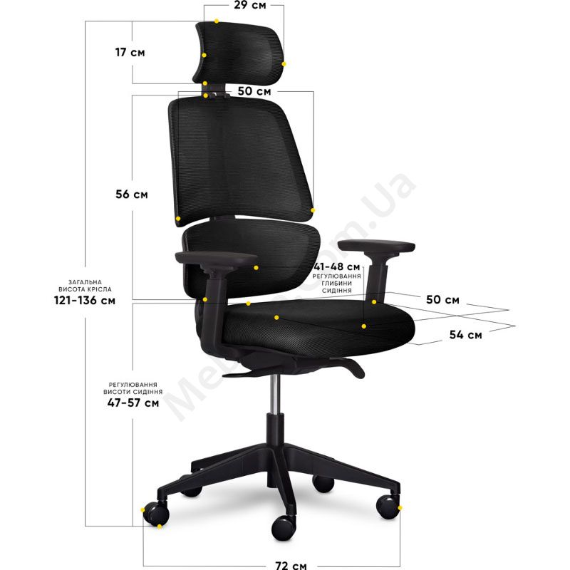 Крісло чорного кольору з регульованими підлокітниками, підголівником та регулюванням глибини.