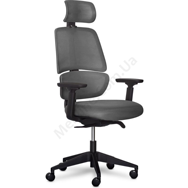 Крісло темно-сірого кольору з регульованими підлокітниками, підголівником та регулюванням глибини.