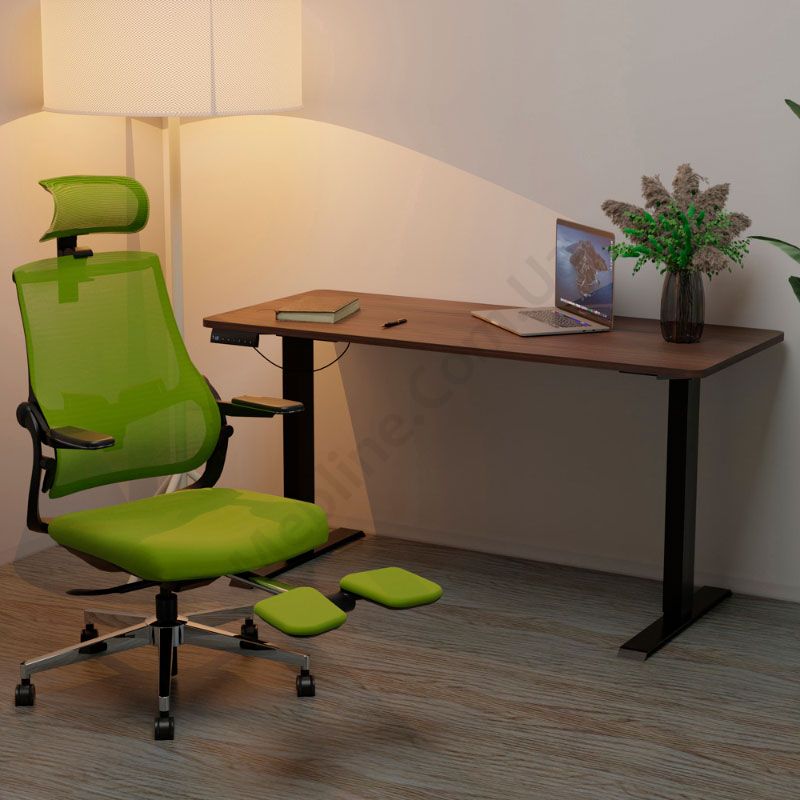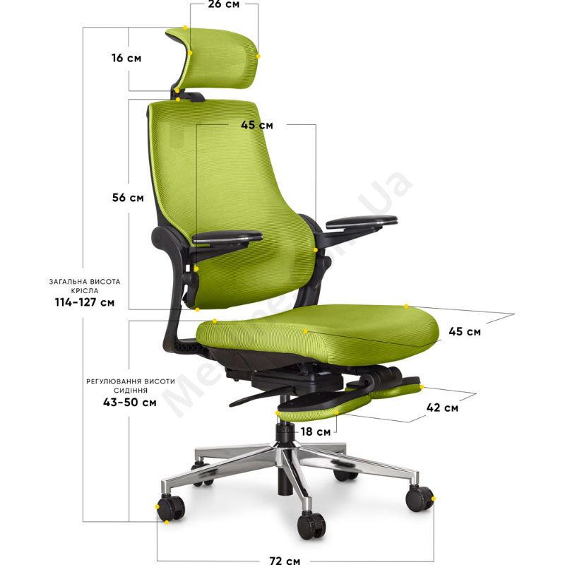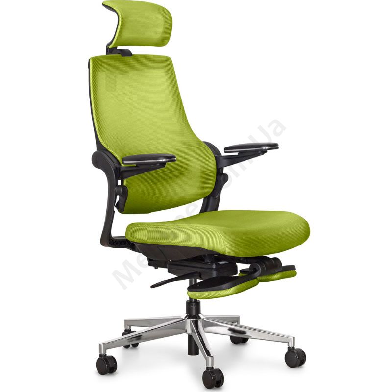 Крісло зеленого кольору з сітчастою спинкою та підставкою для ніг.