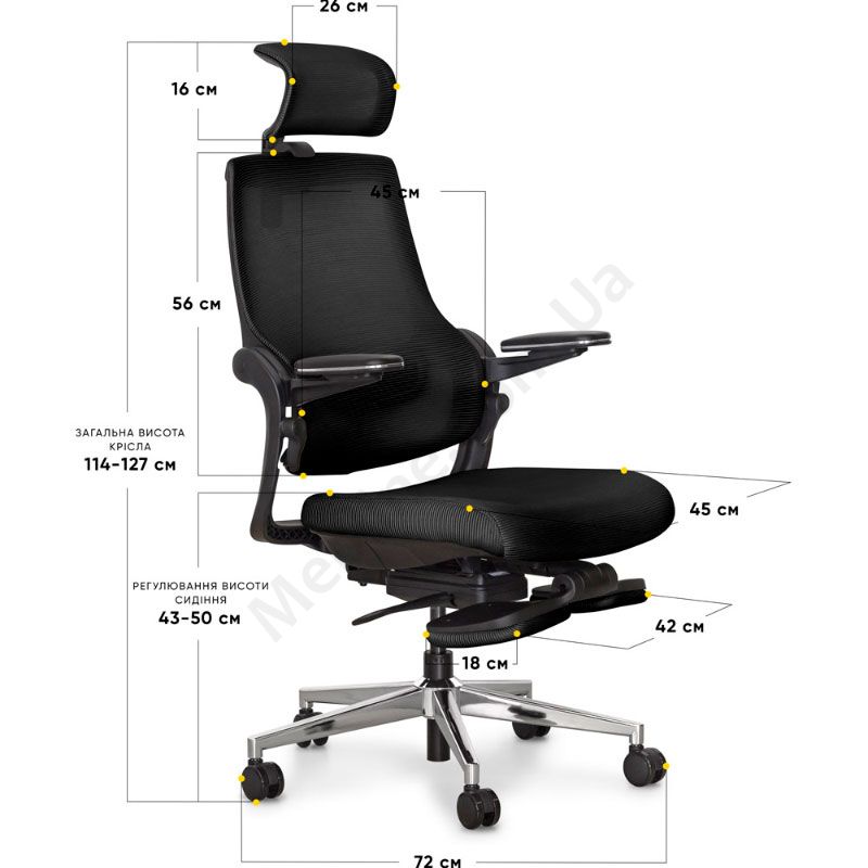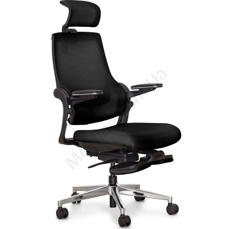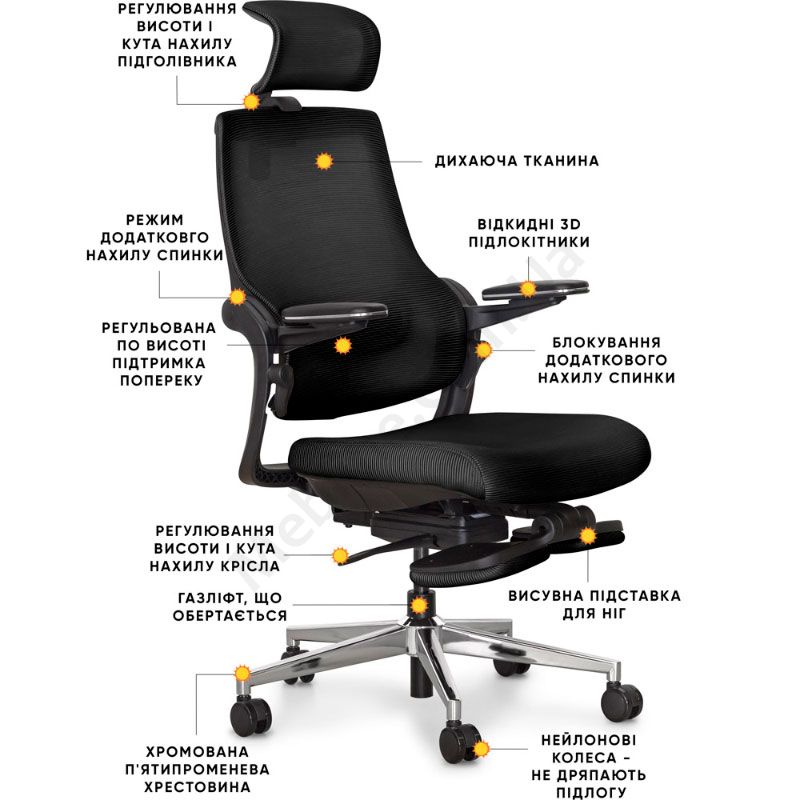 Крісло чорного кольору з сітчастою спинкою та підставкою для ніг.