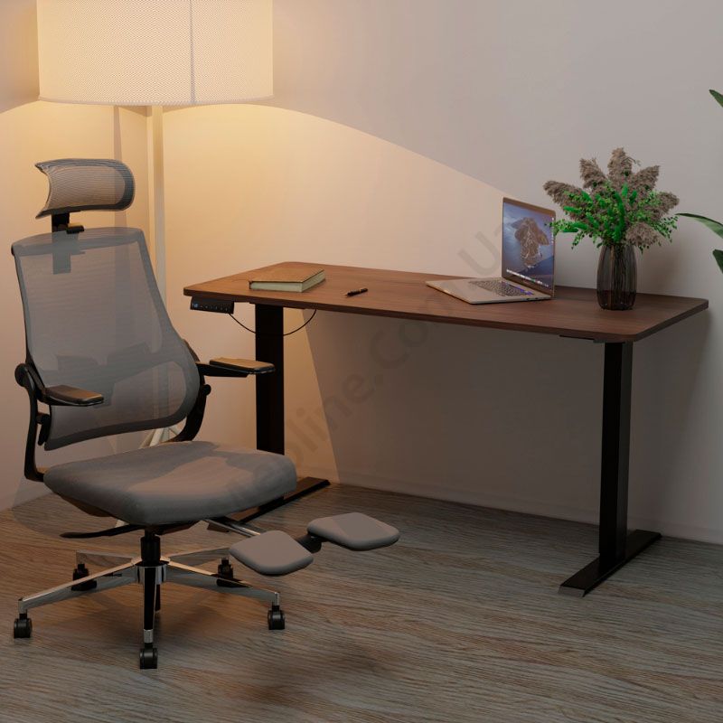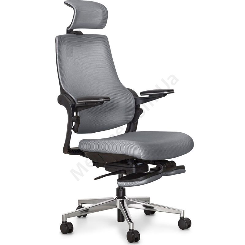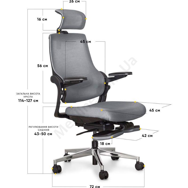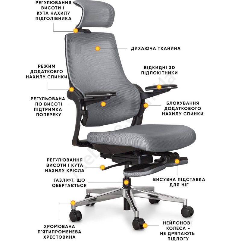 Крісло сірого кольору з сітчастою спинкою та підставкою для ніг.