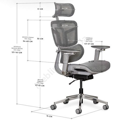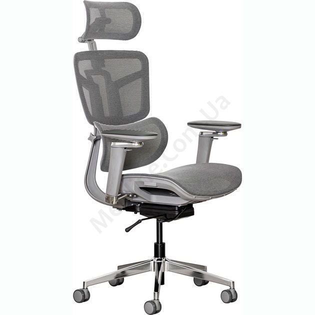 Крісло сірого кольору з сітчастою спинкою, регулюванням підлокітників та підголовника.