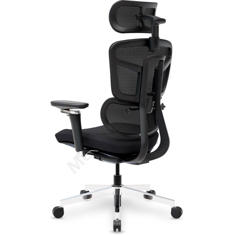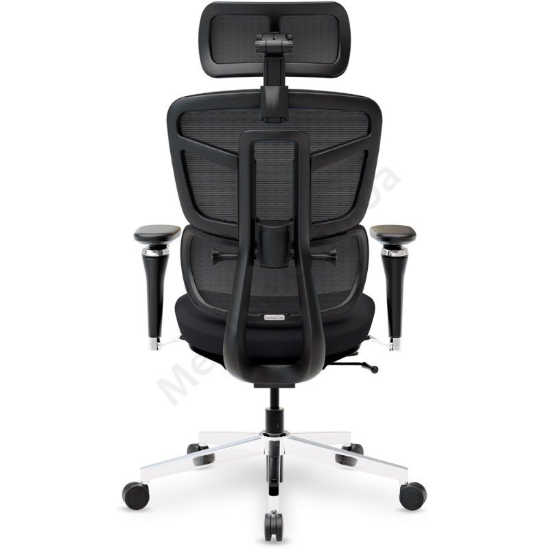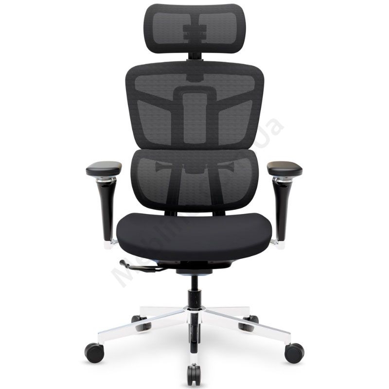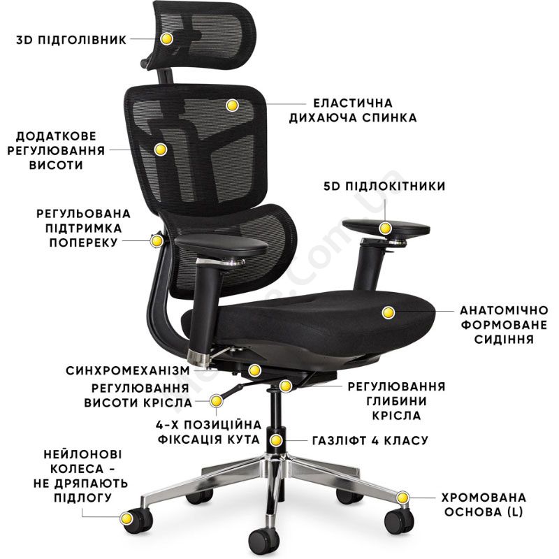 Крісло чорного кольору з еластичною спинкою, регулюванням підлокітників та підголовника.